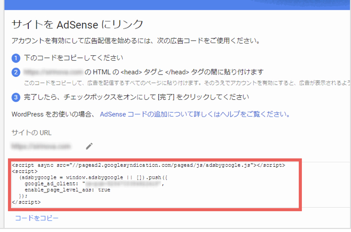 案内に従って必要な項目を入力していくと、アドセンスの審査を受けるためサイトにためのコードが表示されます。