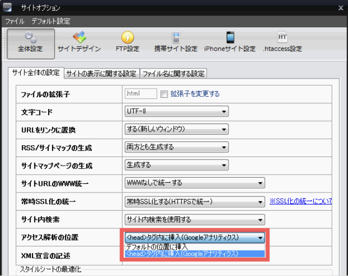 アドセンスの審査用コードは<head>内である必要があるため、SIRIUS「サイトオプション」の「アクセス解析の位置」で「<head>内に挿入(Googleアナリティクス)」を設定します。