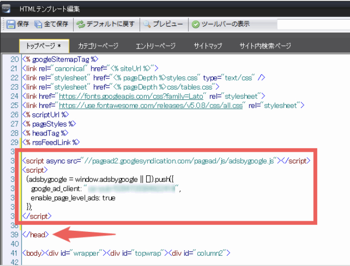 このコードをSIRIUS2の「広告の配信をする全てのページ」の<head>~</head>の間に貼りつけます。つまりトップページ、カテゴリーページ、エントリーページに貼りつける必要があります。