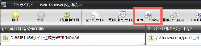 コードを貼りつけたらSIRIUS2編集バーの「サイト生成」→「アップロード」→「HTML/RSSファイルのみ」を行います。