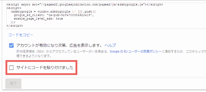 Googleアドセンスのサイトに戻り「サイトにコードを貼りつけました」にチェックを入れて「完了」をクリックします。