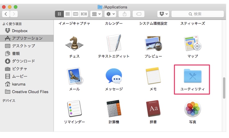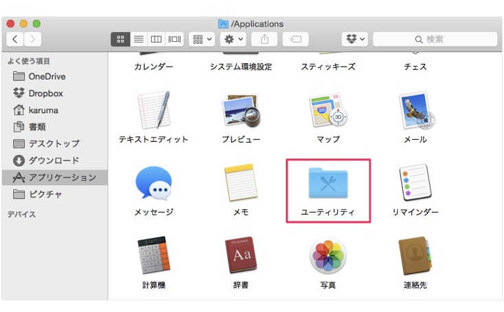 3.Fidner の「アプリケーション」フォルダから「ユーティリティ」をクリック
