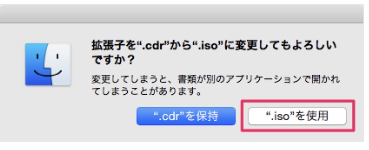 「Enter」キーを押すと、「拡張子を .cdr から .iso に変更してもよろしいですか?」というポップアップが表示されるので、「.iso を使用」をクリックします。