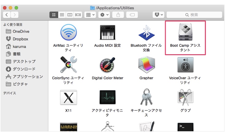 「Boot Camp アシスタント」を起動します。