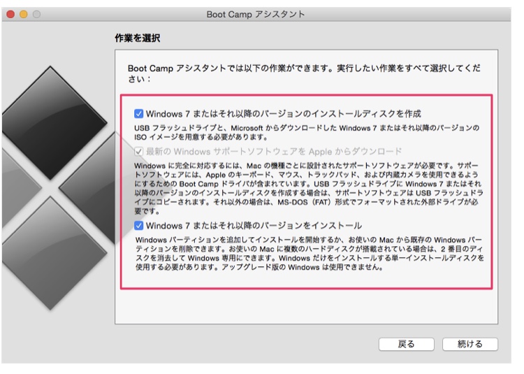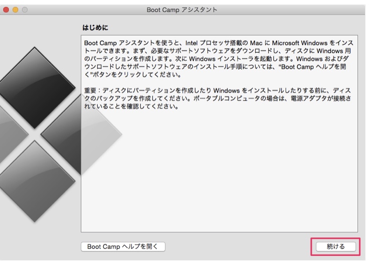 「Bootcamp」アシスタント画面になったら、「続ける」をクリックする。