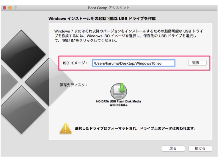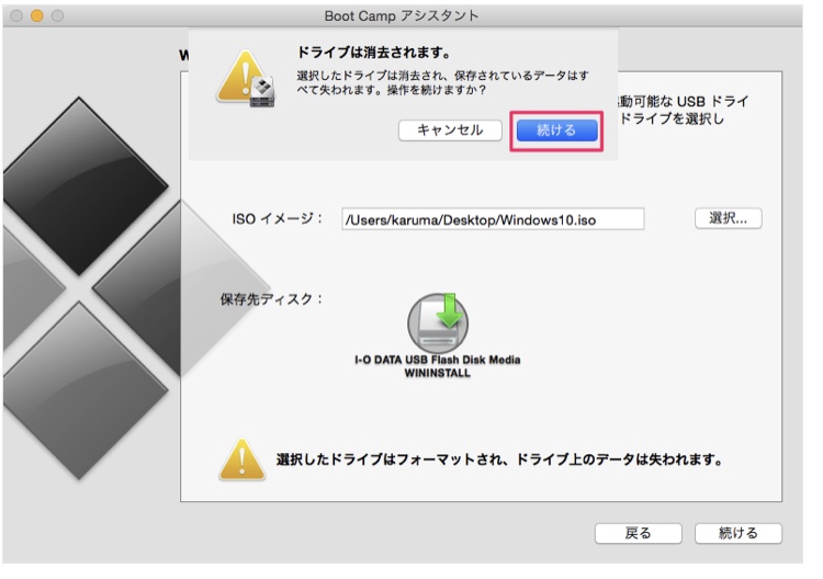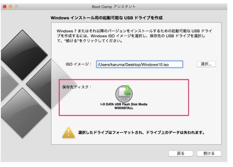 用意したUSBメモリが保存先ディスクになっていることを確認し、「続ける」をクリックをする。
