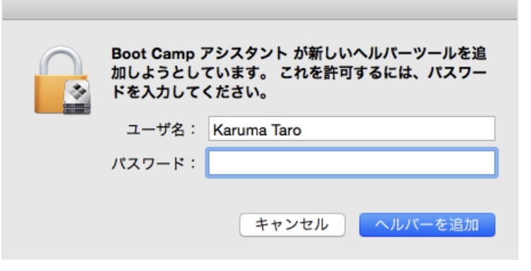 「Boot Camp アシスタントが新しいヘルパーツールを追加しようとしています。」というポップアップが表示されるので、「パスワード」を入力し「ヘルパーを追加」をクリックします。