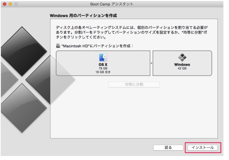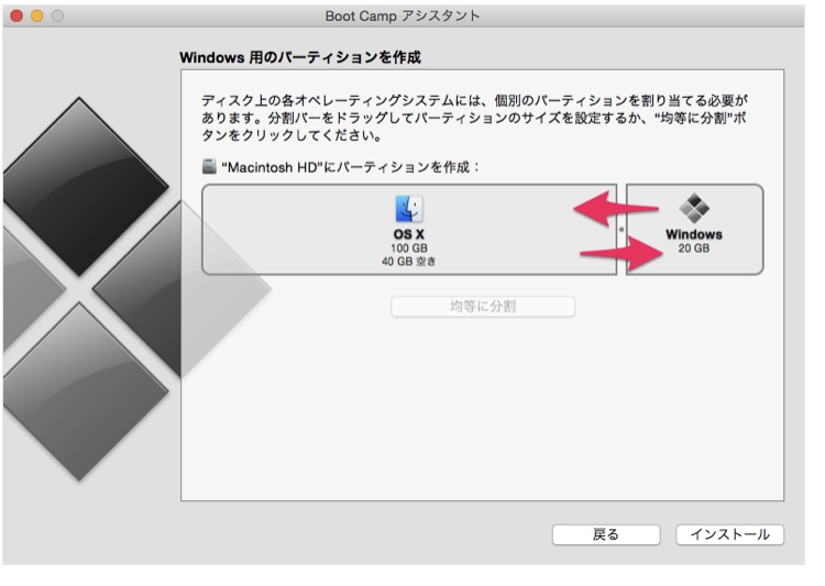 Windows用のパーティション作成です。パーティションのサイズをドラッグ&ドロップで調節します。