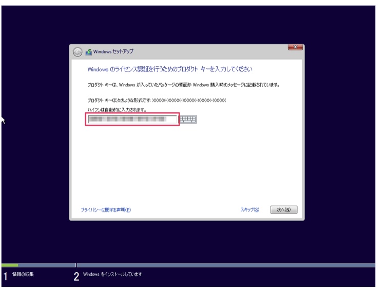 「プロダクトキー」を入力し、「次へ」をクリックします。