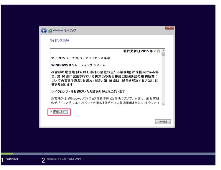 次にライセンス条項です。「同意します」にチェックを入れ、「次へ」をクリックします。