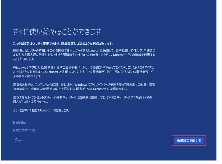 Windows の設定です。後からでも変更できるので、「簡単設定を使う」をクリックします。