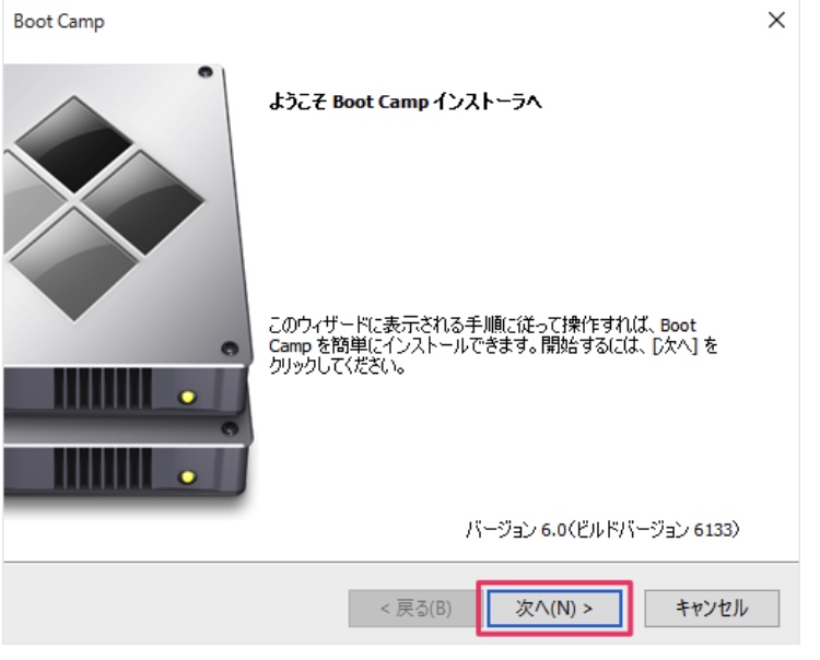 デスクトップに「ようこそ Boot Camp インストーラへ」というウィンドウが表示されているので、「次へ」をクリックしまします。
