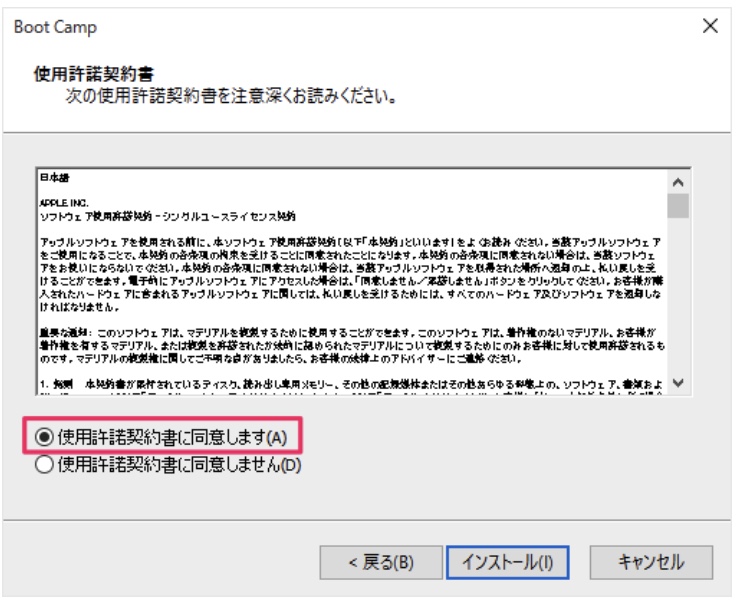 「使用許諾契約書に同意します。」を選択し、「インストール」をクリックします。