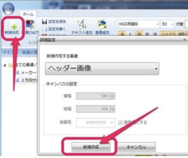 SIRIUS上部の「編集」→「ヘッダー画像」→「ヘッダー画像の編集」をクリックします。編集ページが開きますので左上の「新規作成」をクリックし、さらに開いたページで「新規作成」をクリックします。